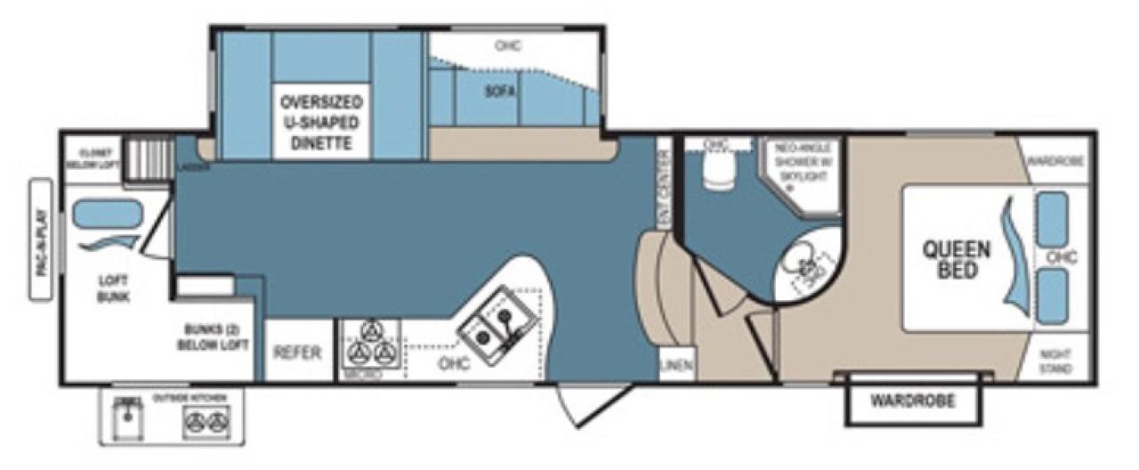 2 Slides, Sleeps 10, Bunks & Loft, 4 Point Auto Level, Slam Latch Baggage Doors, Ducted Air Conditioning, Molded Fiberglass Cap, Rear Ladder, 16" Aluminum Wheels, Spare Tire & Rim, Exterior Kitchen, Power Awning, 6 Gal Gas/Elec Water Heater, Entry Assist Handle, Dual 30# LP Tanks, Booth Dinette, 6 Cu Ft Fridge, 3 Burner Range, Microwave, Solid Surface Countertops, Pleated Shades, Ceiling Fan, TV