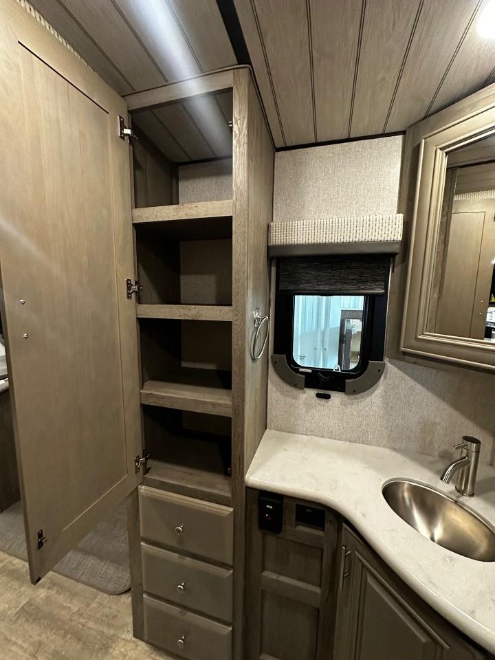 EZ Lube Axles with Nev-R Adjust Brakes, 16" Aluminum Wheels, Heavy Duty Greaseable Suspension, MorRyde CRE-3000 Suspension, 12V Power Tongue Jack, MorRyde Step Above, HD Ladder, Slam Latch Doors with Magnetic Catches